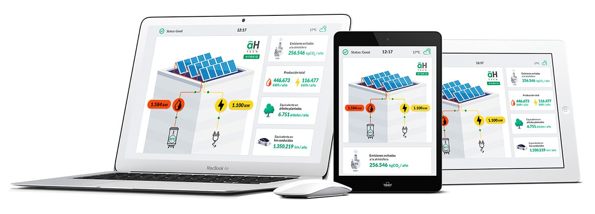 El aHMonitor es una herramienta avanzada que permite gestionar y optimizar instalaciones solares híbridas desde una única plataforma. Conectado a inversores fotovoltaicos y reguladores térmicos, recopila datos en tiempo real tanto de la producción eléctrica como del rendimiento térmico.