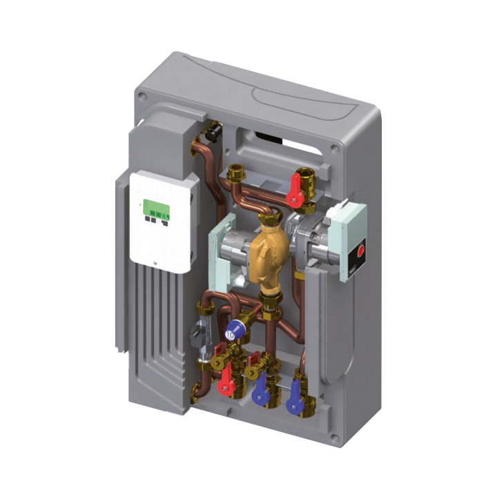 La regulación de la temperatura del agua caliente sanitaria (secundaria) se realiza mediante la modulación del caudal del fluido vector primario a través de una bomba de alta eficiencia de caudal variable controlada por el regulador electrónico MFWC con control PWM.